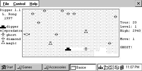 You (the digger) are digging in the sand to collect diamonds while trying to avoid the predator and the ghost. Use the four arrow keys to move the digger. You fail if you are caught by the predator. Your digging speed in sands is twice as fast as the predator's, but in the tunnels you dug, you are four times faster than it is. However, the ghost appears randomly in your tunnels and fills them with sands. Besides, if you are caught by the ghost, you will lose some of your scores. There are magic bottles scattered in the sands. Once you get hold of a magic bottle, for several steps the predator becomes your prey. You have to take your time to catch it since your "magic" does not last long. After you collect all the diamonds, you are entering the next level.