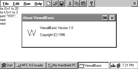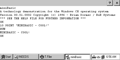 карманном клавиатурном компьютере (H/PC). FREEWARE. Инструкция по установке: A) Распакуйте файлы в пустую временную папку на вашем компьютере. Дистрибутивный файл - ZIP-файл для PC. Некоторые из файлов имеют длинные имена, поэтому не рекомендуется использовать PKUNZIP. 1) Если у вас машина SH3 - (Casio, HP, Compaq, ...), то удалить файлы BASICEMIP.EXE, и BASICESH3.EXE переименовать в файл BASICE.EXE. 2) Если у вас машина MIPS (Velo, NEC, ...), то удалить файлы BASICESH3.EXE, и BASICEMIP.EXE переименовать в файл BASICE.EXE. B) на H/PC: 1) перейти к каталогу My Handheld PC 2) Создайте папку с именем basice (НЕ BASICE!) 3) Войдите в папку basice 4) Создайте папку Lib (НЕ LIB!) 5) Скопируйте все файлы с расширением .UTL в каталоге Lib 6) Скопируйте grtest.bas и basice.exe в папку basice 7) Скопируйте basice.htp в папку Windows на H/PC (вы должны скопировать этот файл, иначе HELP не будет работать. Если вы не скопируете этот файл, то увидите сообщение "Не удается найти e.htp" когда вы выберите Help | Index) C) Для начала - дважды щелкните по иконке basice D) Для запуска демо-программы DEMO.BAS: 1) Откройте демо-программу с помощью меню File | Open. 2) Запустите демо помощью Control | Run. ![]() |