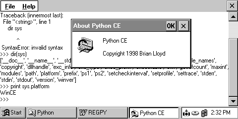 Интерпретатор. FREEWARE. Инструкция по установке: 1. Распакуйте SH3-версию PythonCE-1_0b1-SH3.zip (Casio, HP, Compaq, ...) или MIPS-версию PythonCE-1_0b1-MIPS.zip (Velo, NEC, ...) в пустую временную папку на вашем компьютере. 2. На клавиатурном КПК создайте папку \Program Files\Python. 3. Скопируйте папки Lib и Scripts в \Program Files\Python. 4. Скопируйте python.exe и python15.dll в папку \Windows клавиатурного карманного компьютера. 5. На клавиатурном КПК найдите python.exe, выберите в меню команду Edit...Copy, перейдите в \Windows\Programs и выберите команду Edit...Paste Shortcut. ![]() |